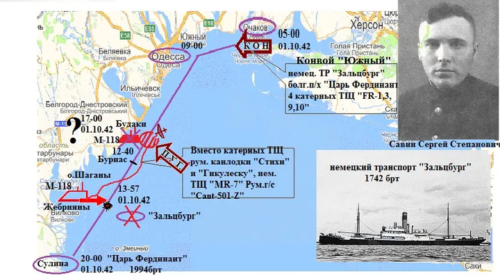 第二天,即9月30日上午,两艘船抵达位于乌克兰南部尼古拉耶夫州的港市奥恰科夫,这座滨海小城面向黑海,毗邻克里米亚半岛,扼守着第聂伯河入海口,地理位置十分重要。一天后,10月1日早上5时(柏林时间),在四艘德国R型近海扫雷艇的护航下,一支运输船队离开奥恰科夫,驶向罗马尼亚的苏利纳港,“萨尔茨堡”号也是该运输船队的一员。