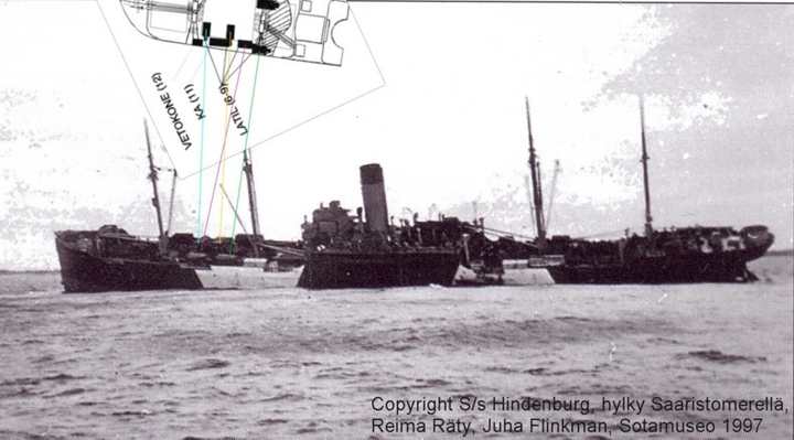 “兴登堡”号遇袭后发生的爆炸造成15人死亡,其中包括6名战俘。此外,还有13名战俘在船上的看守弹压船只遇袭后发生的骚乱时受伤。1942年11月19日,“兴登堡”号在被V-305号拖船拖曳时因进水侧倾,最终沉没于芬兰最南端有人居住的岛屿乌特岛以南、科尔波岛和纳古岛之间的航道中央海域,方位为北纬59度24分、东经21度12分,水深59米。沉船时,许多幸存者被芬兰船只救起。