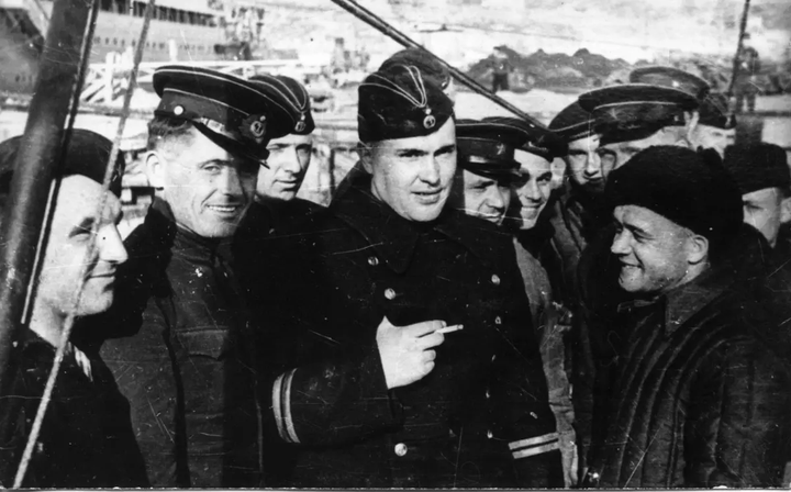 图16.Shch-213号潜艇部分艇员合影,站在中间手里夹着烟的是艇长杰涅日科大尉