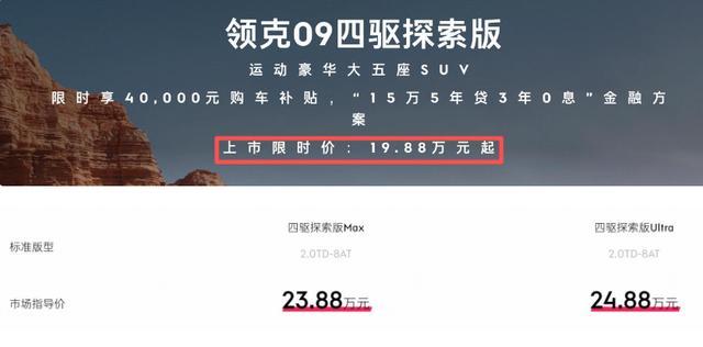 2026款领克09四驱探索版正式上市,指导价23.88万-24.88万元,限时售价19.88万元起,这是领克09车型价格首次下探至20万以内。新车作为年度改款车型,定位大五座SUV,增加了全新的外观内饰配色,诸多配置也有升级,市场竞争力有一定提升。