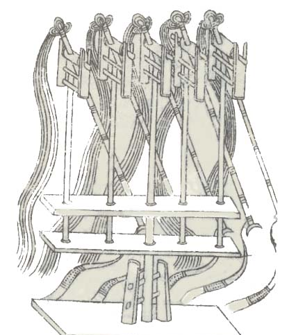 中国的旋风五砲,这是一种可回旋的人力拉拽时杠杆抛石机