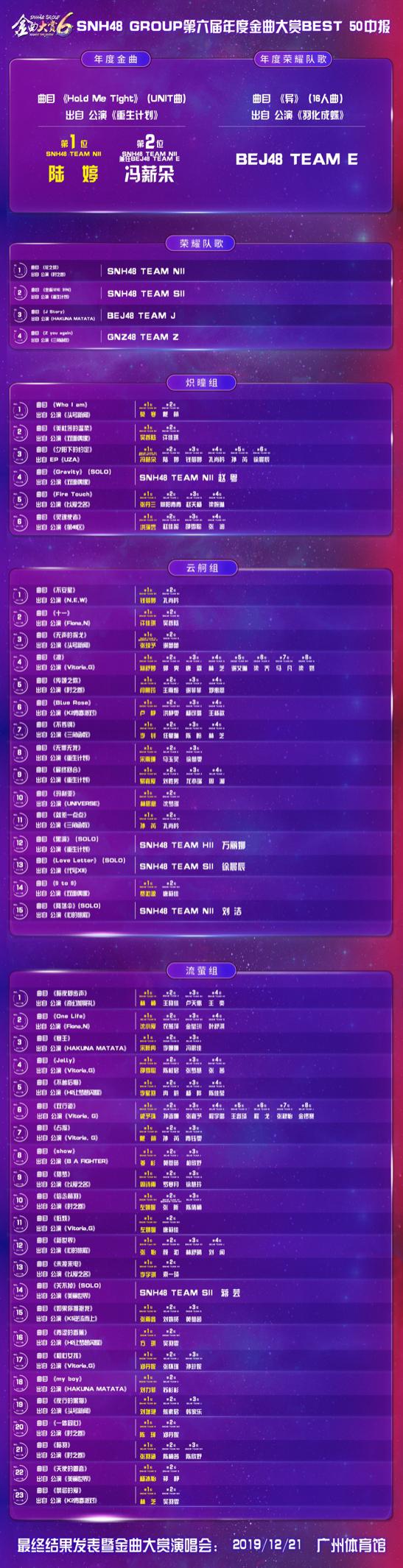 SNH48 GROUP第六届年度金曲大赏中报前50位歌曲、演唱组合及成员顺位提名: