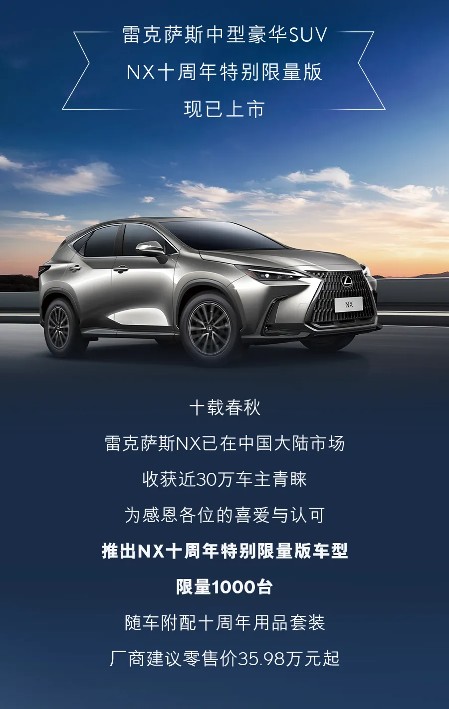 作为参考,雷克萨斯去年推出了 NX 十周年特别限量版车型,限量 1000 台,售 35.98 万元起。NX 十周年特别限量版车型基于 NX 260 创悦版(35.68 万元),升级了多项配置,例如标配电动行李箱背门、方向盘加热功能,同时增加前排座椅通风、协同前排座椅加热,还为驾驶席座椅增配记忆功能。该车车长 4660mm、宽 1865mm、高 1660mm、轴距 2690mm,配备 2.5L 自然吸气发动机,全系标配 LSS+ 3.0 驾驶辅助系统。
