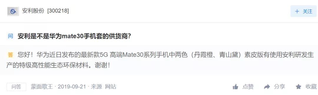 9月21日,安利股份在深交所互动易上回复投资者提问时表示,华为近日发布的最新款5G高端Mate30系列手机中两色(橙、绿)素皮版有使用安利研发生产的特级高性能生态环保材料。