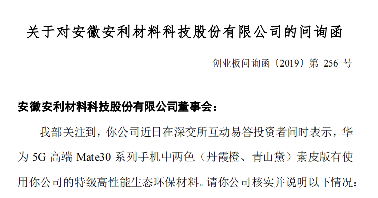 9月23日晚间,安利股份收到创业板问询函,共涉及5个问题,要求说明华为使用公司产品的具体名称、营收、产销量、毛利率等情况,核实相关信息披露是否存在误导或忽悠投资者情形,还要说明董监高以及持股5%以上股东买卖股票、减持情况。