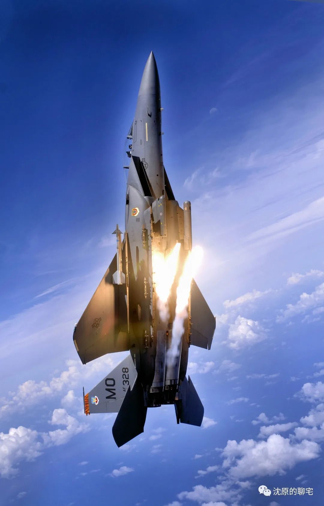 F-15战斗机进气道下方左侧的一个投放器投放红外干扰弹