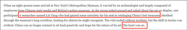 可在这篇文章里,专注于研究圆明园流散文物的刘阳被抹黑成“因热衷于对中国丢失的文物进行编目而声名狼藉”,还把2009年中国团队前往纽约大都会博物馆的正常学术考察污蔑成“狩猎”(hunt),特意描绘刘阳到处搜寻可能认识的藏品这一细节。