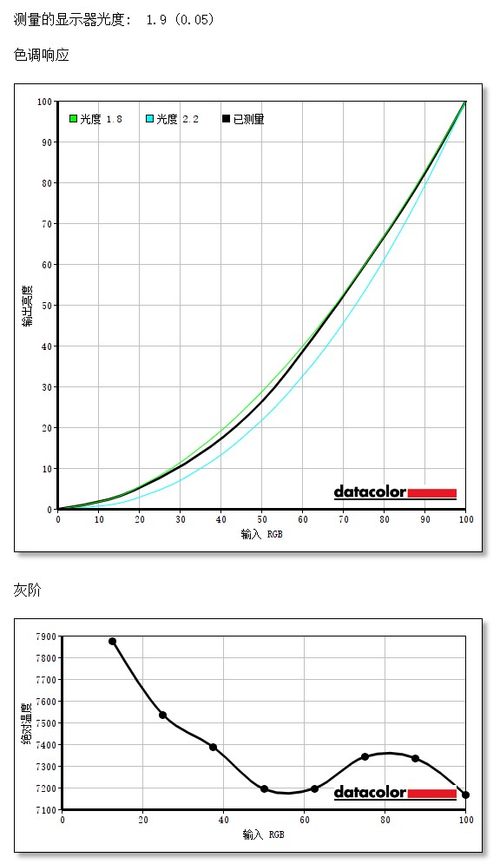 在Gamma曲线的测试环节中,两条光度曲线与黑色的线距离更近,且平滑过渡,这说明此款显示器的Gamma曲线是非常出色的。理想中的状态是三条线完成重合,然后将图像成对角线分割,但是在实际测量中,几乎没有显示器能够到达到绝对理想状态。此外,灰阶的曲线范围为7100-7900,虽然动荡的区域很大,但是其波动的区域也仅仅是在7200-7350之间,表现很是稳定。