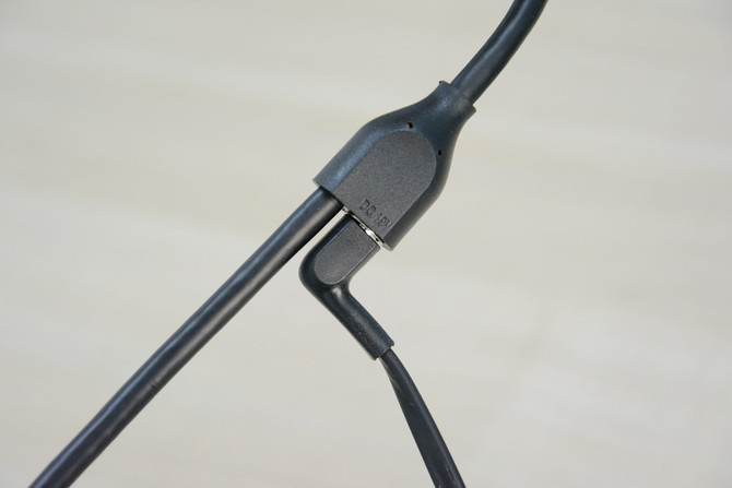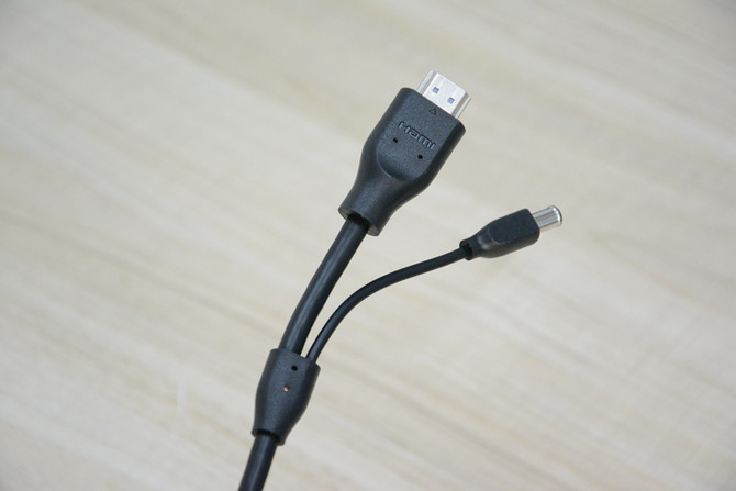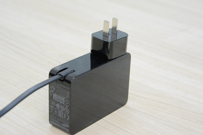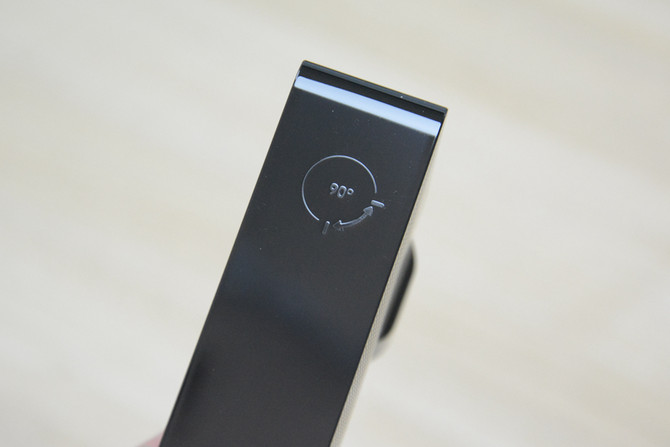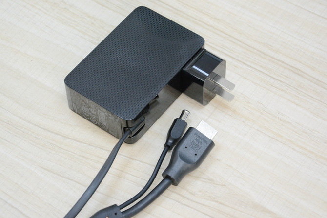 在组装显示器的时候,我们看到这款显示器的附件中,电源适配器和HDMI线缆也做了特别的设计,电源适配器的体积已经非常小巧,在机身上可以看到能实现90度旋转,也就是双相的插头是可以旋转角度的,这样的好处就是面对不同的插排可以更加灵活。