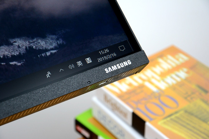 下边框略宽,喷砂质感的边框,并在左下角有SAMSUNG的标识。整个显示器看上去像一个边角方正的大平板。