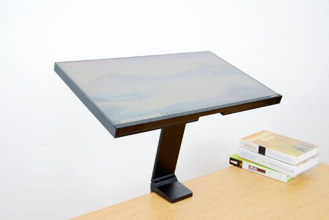 支架上有两个转轴,其中一个是与显示器的连接处,用于调节显示器的仰角;另一个转轴在桌面处,通过垂直、下压等角度来调节显示器的高度。当支架处于垂直状态时,显示器可以贴墙,实现完全不占用桌面空间。当下压支架并同时调节显示器角度时,显示器可以实现与桌面平面贴合,此时显示器距离用户的距离也会更近。