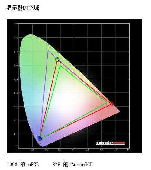 100%的sRGB色域表现达到最高水平,这个数据也是一款显示器是否合格所具备的基本条件。AdobeRGB为84%。而一般显示器的AdobeRGB色域数值大致在72%-80%之间,也可见这款显示器的表现是优于大多产品。