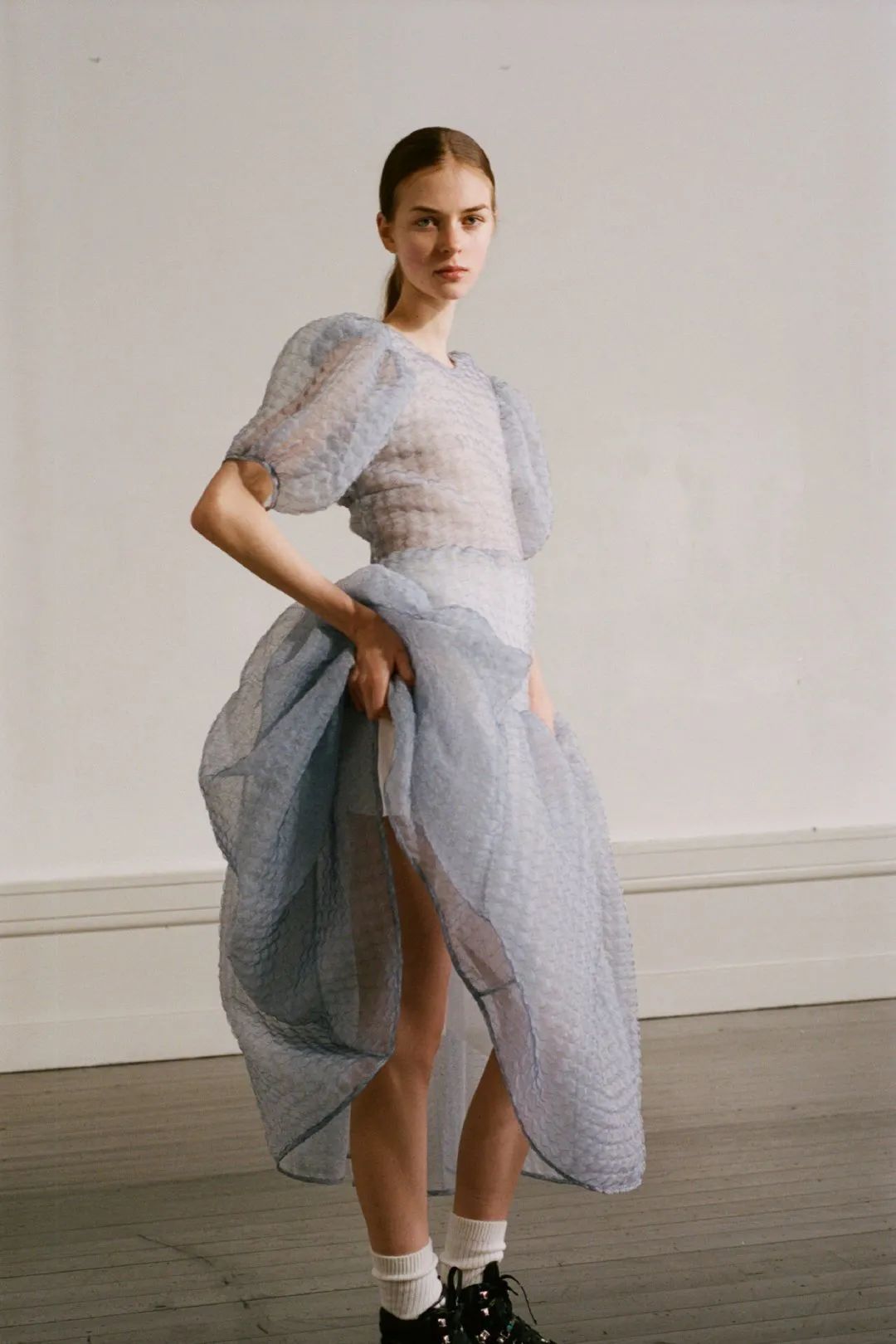不仅款式值得夸,材质也是Cecilie Bahnsen的一大特色,无论是薄纱、钩花、褶皱,还是像毛衣一样的编织,棉被一样的绗缝……它都能给变得立体起来。