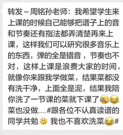 前段时间著名钢琴教育家周铭孙对吐槽钢琴课的“洗菜论”让很多钢琴老师深感共鸣。他吐槽学生课后练琴没有认真读谱,回课的时候整节课都在纠正错音和节奏,就像学做菜,而整节课却是在洗菜,不能学做菜。
