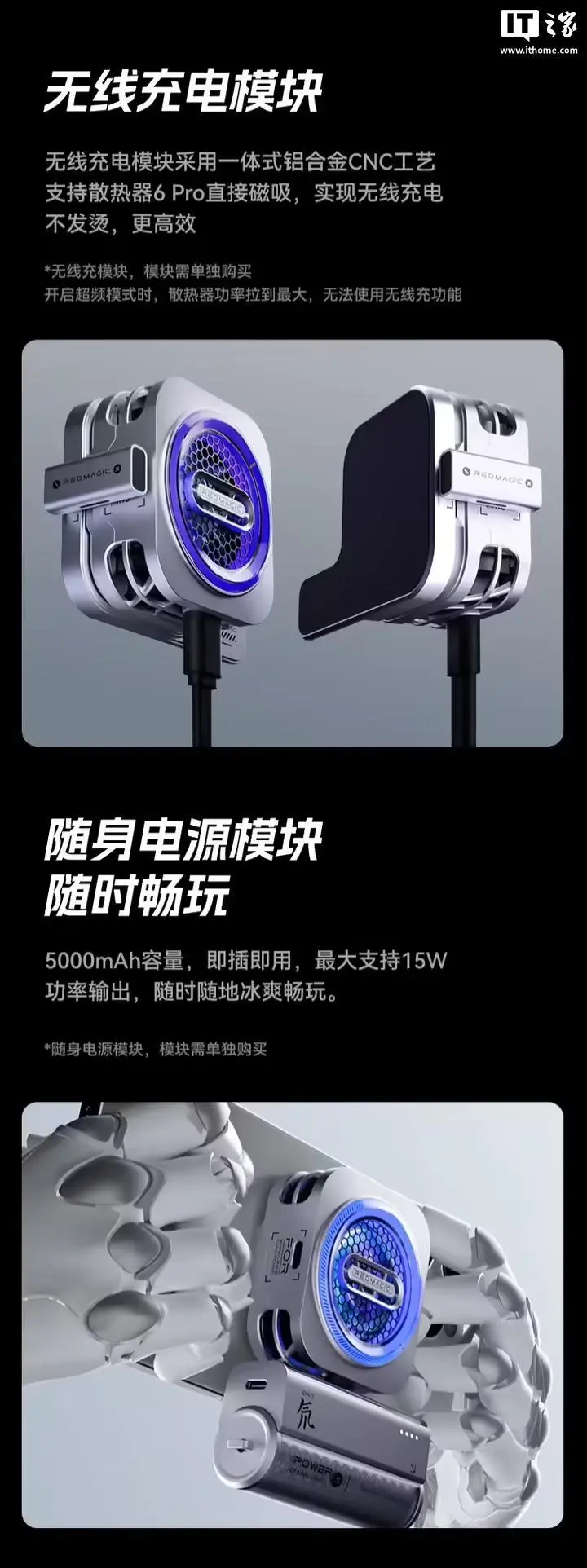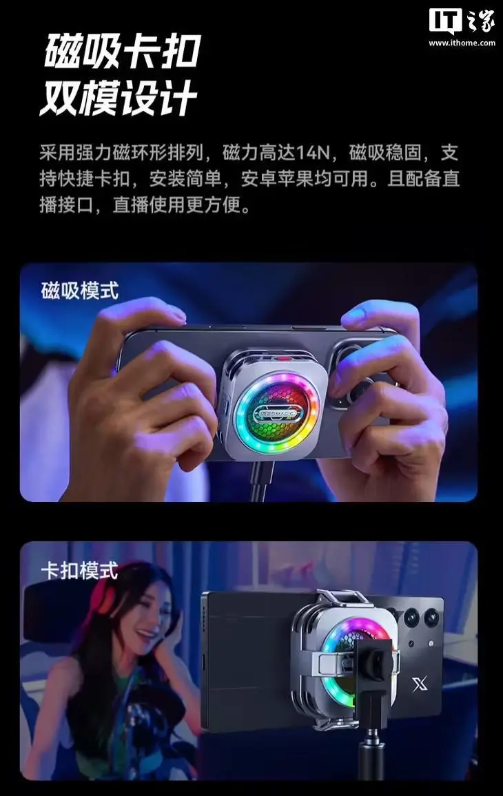 该散热器拥有16颗RGB灯珠,采用模块化设计,可以搭配14N磁力的磁吸模块吸附在具有磁吸功能的手机上,也可以搭配卡扣模块安装在没有相应磁吸功能的设备上,还能搭配无线充电/有线充电模块为设备充电,不过这些模块具体定价尚未公布。