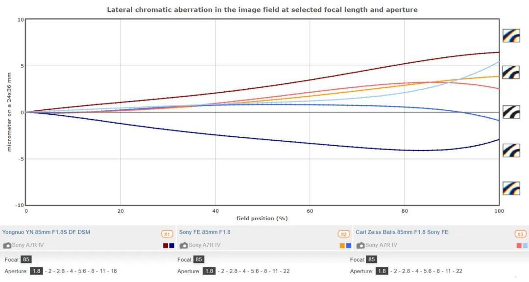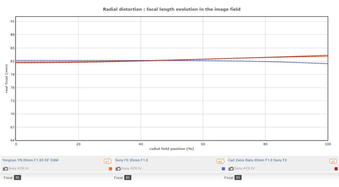 正如您所期望的那样,在 85mm 焦距上,三款镜头的几何失真都得到很好的控制,但索尼在整个视野中要比蔡司、永诺更均匀。