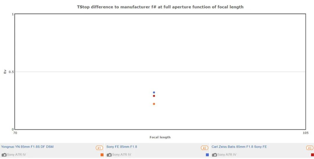 相对F值,测量 T值可以让您知道这款镜头是否适合进行摄像,但它与静止图像并不真正相关。通光量可能表明镜头如何处理眩光和重影,但这不是这里测试的内容。无论如何,永诺 1.9 T值测试数据,非常接近测量为 2 的索尼和蔡司。三个镜头都与 F值有大约 -0.3 EV的差异。
