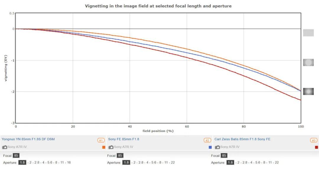 使用永诺 YN 85mm F1.8 S DF DSM 进行全开拍摄时,暗角非常明显。缩小到 F4 时有明显的改善,但即使在最小的光圈下,一些暗角仍然存在。在 F1.8 时,永诺与竞争对手相比表现出色。它与索尼处于相似的水平,并且明显优于蔡司。但是,通过缩小光圈,两个对比的镜头暗角减少更多。从F2.8开始,索尼和蔡司明显优于永诺,索尼和蔡司最高光圈设置差别不大。