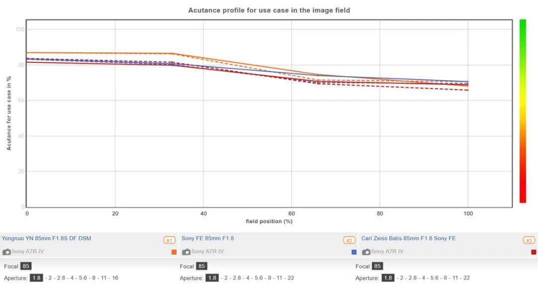 DXOMARK将永诺镜头与索尼 FE 85mm F1.8 、卡尔蔡司 Batis 85mm F1.8 进行了比较,它们都在同一台相机上进行了测试。两款对比的镜头都提供与永诺相同的最大光圈,但更长更重。最重要的是,它们也更为昂贵。让我们看看更实惠的永诺 YN 85mm F1.8 S DF DSM 能否PK老牌厂商的竞品。
