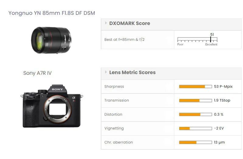 DXOMARK在 6100万像素索尼 A7R IV 上测试了永诺 YN 85mm F1.8 S DF DSM,相机传感器和镜头共同获得了 51 分的 DXOMARK 分数。这是一个很好的分数,使永诺成为数据库中全画幅E卡口相机的最佳 85mm 镜头,尽管仅比 Sony FE 85mm F1.4 GM 高出 2 分。