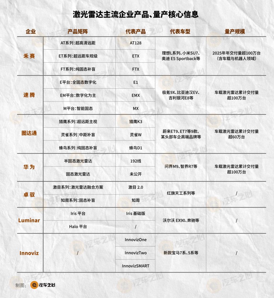第一类,以速腾、禾赛、图达通为代表的头部玩家,用大规模量产实绩形成先发优势;