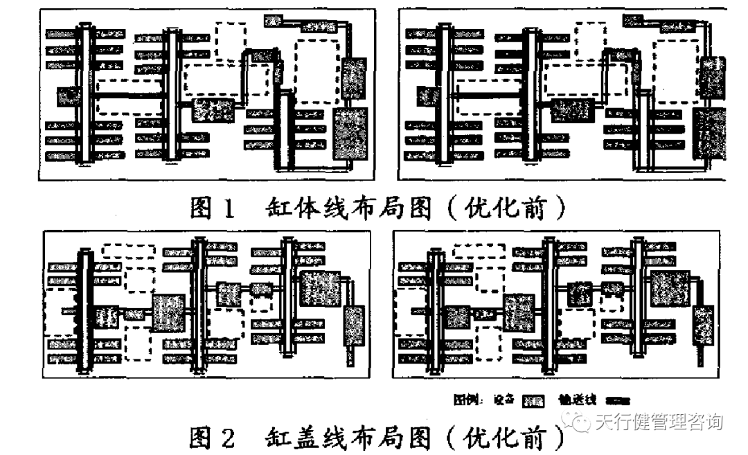 某汽车股份有限公司发动机工厂于2007年投产,生产B系统小排量发动机,产能为35万。工厂投产后,半年内就完成了三班的产能爬坡,公司的快速发展,对发动机提出了扩能的要求,如何以最低的成本快速的提升发动机的产能成为了我们研究的课题。通过对工厂生产线的布局分析,我们发现缸体、缸盖线通过优化布局可以节省出一个模块的空间,可以为第三个模块提供场地条件。天行健精益生产管理咨询公司。原生产线布局是项目引入国外技术专家们的经验布置,缸体缸盖线的加工中心采用u型布局方式(图1、图2),各分两个模块,每个模块产能为17.5万台/年,缸体单模块长72m,宽40m,面积为2880㎡,单位面积产能为175000/2880=60.76台/年,缸盖单模块长72m,宽3O.5m,面积为2196㎡,单位面积产能为175000/2l96=79.69台/年。