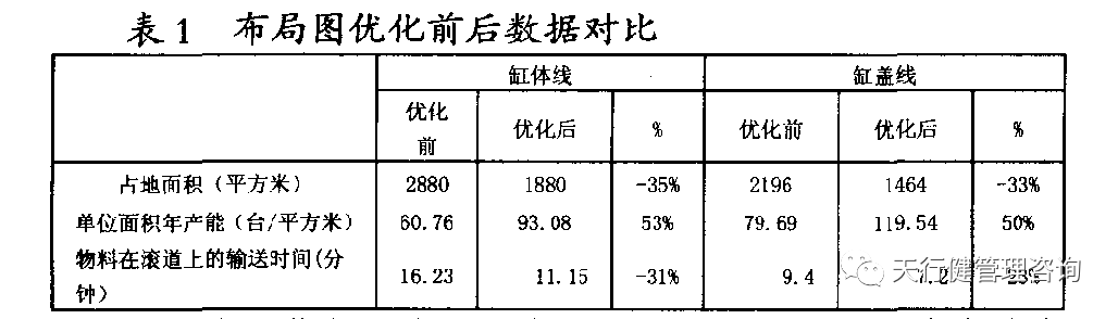 通过布局优化,在不改变现有工艺的基础上,生产线宽度不变,在长度方向上有了较大的缩短,提高了工厂单位面积产能,大大提高了场地利用率,零件从上线到下线的非增值时间也大幅缩短了,整线的生产效率得到了提高,更为重要的是为整个工厂节省了3464㎡的空间,为下一步新生产线规划提供了场地条件,不需要新建厂房,既减少了项目投资又缩短了项目周期。