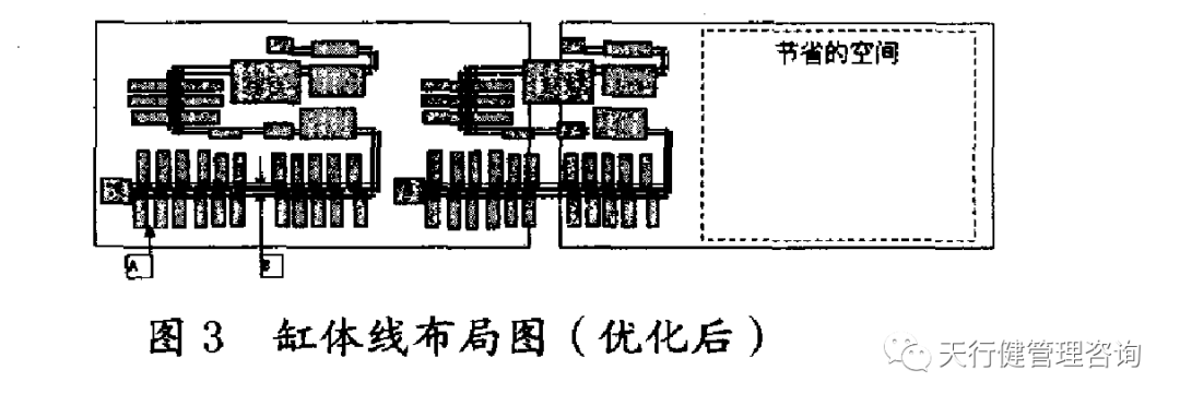 图3、图4是根据以上策略优化布局后的布局图,可以看出工艺的流程并没有改变,设备之间的距离(设备维修保养工作空间,图二中A箭头所示)也没有改变,操作工工作空间(图中B箭头所示)根据人机工程进行优化,适当进行了减小,这样的调整使生产线的占地面积有了大幅的缩减,设备之间的输送线也大地缩短了,布局优化后缸体线占地长47m,宽40m,总面积由原来的2880㎡降为1880㎡,单位面积年产能由6O.76台/年㎡提高至93.1台/年㎡,提高了53%。天行健精益生产管理咨询公司。缸盖线布局图优化后占地长度缩减为48m,宽为3O.5m,总面积由原来的2196㎡降为1464㎡,单位面积年产能由79.69台/年㎡提高至119.54台/年㎡,提高了50%。
