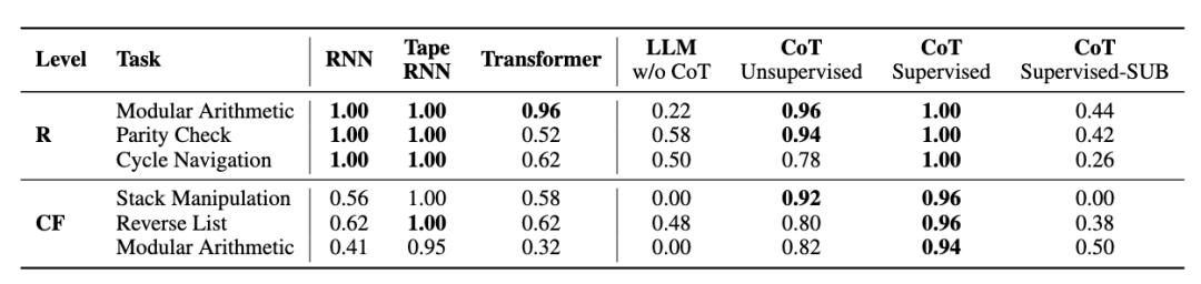 为了验证上述理论框架的有效性,研究团队进行了一系列精心设计的实验。他们选取了涵盖不同计算复杂度等级(包括常规 Regular、上下文无关 Context-Free 及上下文敏感 Context-Sensitive 等)的基础推理任务,这些任务本身对计算深度有较高要求,通常超出标准 Transformer 架构的直接处理能力,因而非常依赖 CoT 机制来辅助完成。实验中使用了 gpt-4o-classic 网页版及 gpt-4o mini API,并特别注意通过统一输入格式(如将字符串任务转换为列表格式)等方式,来最小化 Tokenization 等外部因素对实验结果的干扰。