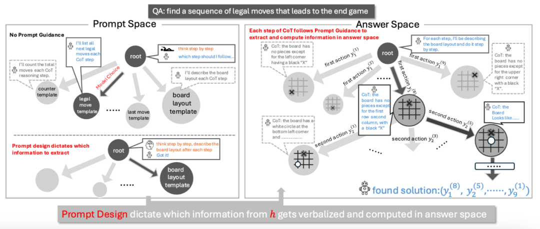 图 6:CoT 的整体空间可以分解为「Prompt 空间」和「答案空间」。在 Prompt 空间中选择不同的 Prompt 设计(例如,决定在象棋推演的每一步是提取「棋盘布局」还是「剩余棋子数」),会直接影响在答案空间中导航并找到解决方案的路径和效率。