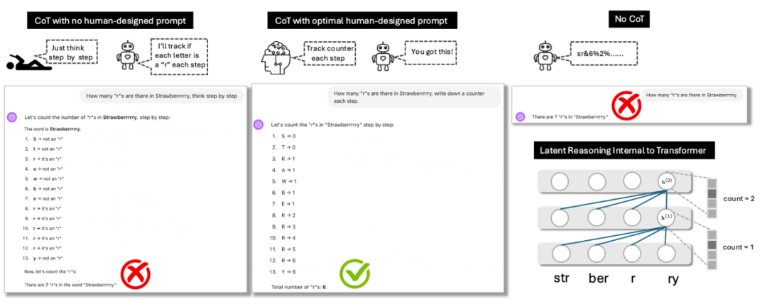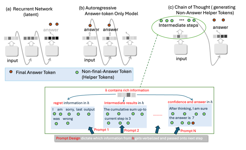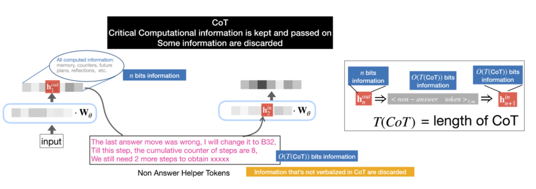 图 3:CoT 通过生成非答案的辅助 Token(中间步骤),近似了循环网络的计算方式。模型内部隐藏状态 h 中蕴含的丰富信息(如先前的错误、中间结果、置信度等)可以通过不同的 Prompt 设计被选择性地提取并言语化。