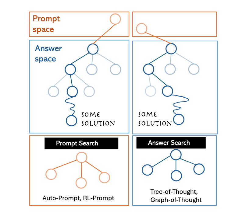 图 1:Prompt 模板深刻影响着答案空间的配置和导航方式。左侧展示了不同的 Prompt(如 Auto-Prompt、RL-Prompt)如何在「Prompt 空间」中进行搜索,而右侧则展示了在特定 Prompt 指导下,如何在「答案空间」中进行搜索以得到解决方案(如 Tree-of-Thought、Graph-of-Thought)。