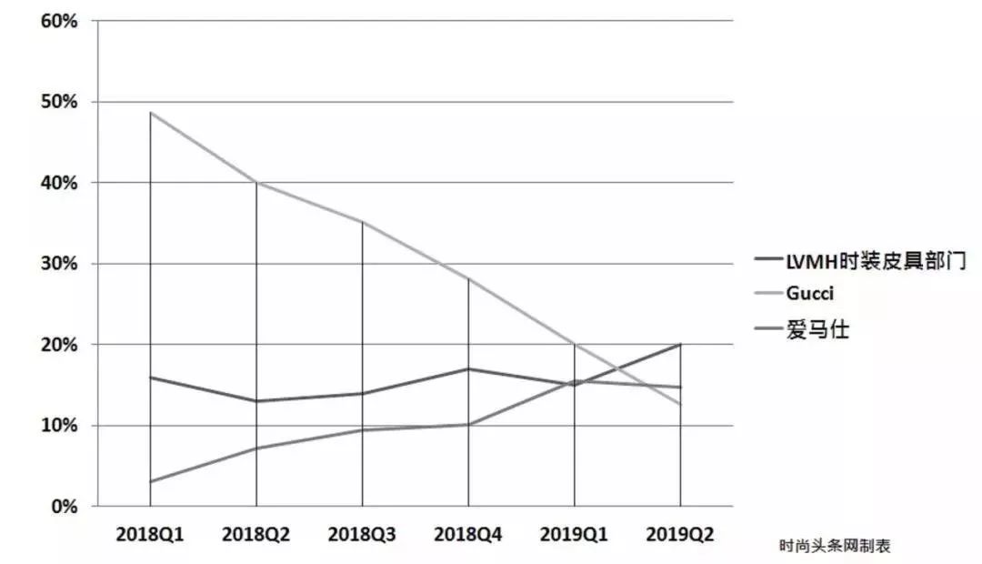2019年上半年,在收入增速方面,LVMH时装皮具部门赶超Gucci和爱马仕,成为跑得最快的头部品牌,连续11个季度录得双位数增长。 而Gucci则开始走下坡路,区别于2017年和2018年的全速奔跑,该品牌上半年销售额的增长持续减速,仅录得19.8%的增幅至46.17亿欧元,创三年来最低增长。