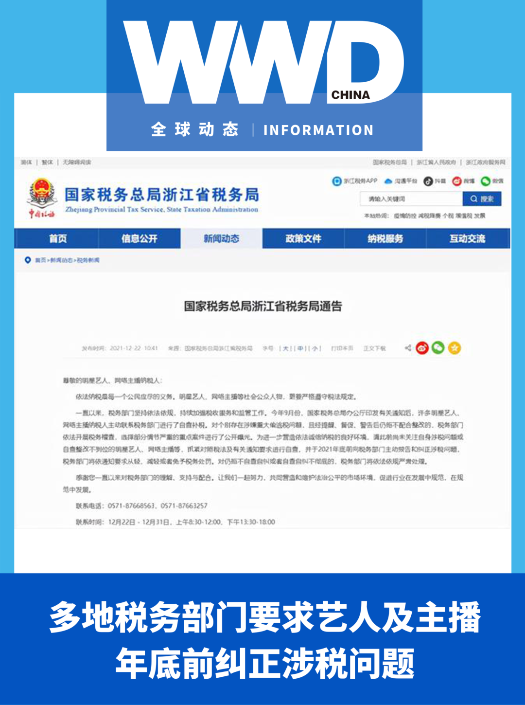 12 月 22 日,北京、上海、广东、江苏等地税务部门发布公告,要求此前尚未关注自身涉税问题或自查整改不到位的明星艺人、网络主播等,抓紧对照税法及有关通知要求进行自查,并于 2021 年底前向税务部门主动报告和纠正涉税问题,对仍拒不自查自纠或者自查自纠不彻底的,税务部门将依法依规严肃处理。