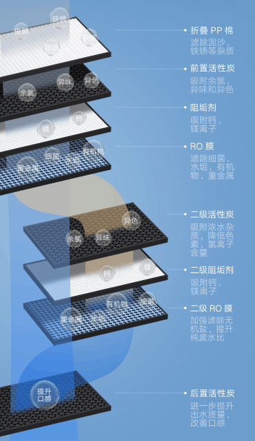值得一提的是,副RO滤芯还可保护主RO滤芯,并采用RO抗堵分离技术,让主滤芯寿命保持5年。
