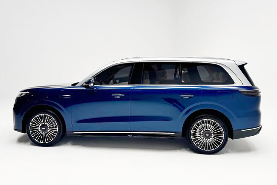 侧面的设计十分简约,没有过多复杂的线条,而双色车身以及大尺寸多辐轮圈的加入,为侧面增添了浓重的高级感。车身尺寸方面,新车长宽高分别为5150mm*1995mm*1800mm,轴距为3100mm,其内部将采用2+2+2的六座座椅布局,二排为两个独立座椅,可前后移动。