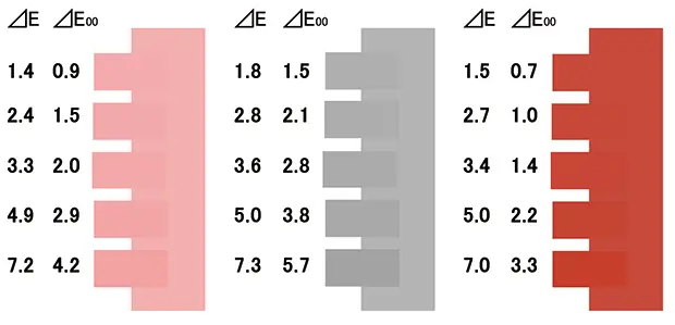 △E色差值是由CIE国际照明委员会提出的国际标准,其中,delta表示“差异”,这个E就是Empfindung“感觉”的意思,表示感觉上的差异。△E数字越大颜色越偏,数字越小颜色越准。在同一台设备上,不同色彩的画面测出的△E值也会不同,因此我们需要格外关注一台显示设备的平均△E(*测得的所有色差值的平均值)。