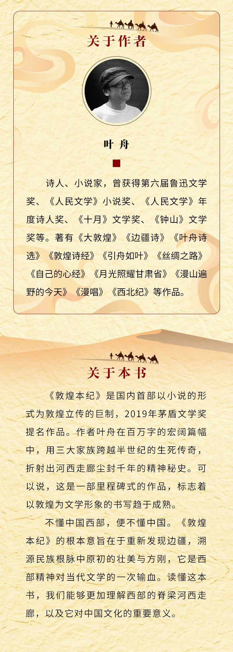 2019年8月公布的第十届茅盾文学奖十部提名作品中,有一部著作以109万字的篇幅,探寻古老的敦煌从哪里来,又将往何处去。它就是《敦煌本纪》。这是国内首部以小说笔法为敦煌立传的长篇巨制,作者叶舟以三大家族跨越半世纪的命运沉浮,重述河西走廊尘封千年的精神秘史。河西走廊有了这部《敦煌本纪》,正如关中平原有一部《白鹿原》。