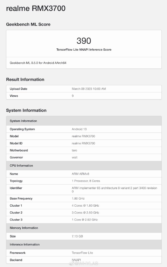据微博博主 @WHYLAB 等爆料,首个高通 SM7475 量产机 Geekbench ML 跑分出炉,分数 390 分。机型是 realme GT Neo5 SE(型号为 realme RMX3700),搭载 8GB 内存,采用安卓 13 系统。CPU 为一颗 2.92GHz 超大核 + 三颗 2.5GHz 大核 + 四颗 1.8GHz 小核,堪称“骁龙 8+ Gen 1 青春版”。