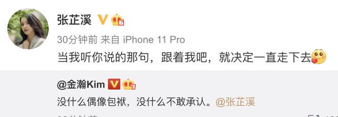 昨日,金瀚发文承认与张芷溪恋情:“没什么偶像包袱,没什么不敢承认。”