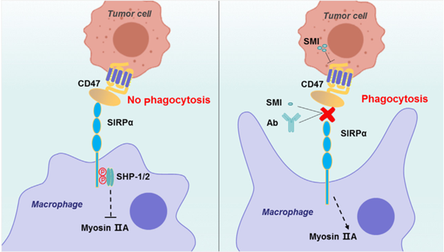 当位于肿瘤细胞表面的CD47与巨噬细胞表面的SIRPα相互作用时,它将SIRPα的胞内部分磷酸化,然后激活SHP-1和SHP2,从而抑制肌球蛋白IIA,阻止巨噬细胞吞噬。当使用抗体(Ab)或小分子抑制剂(SMI)阻断或干扰CD47/SIRPα时,CD47/SIRPα被破坏会导致巨噬细胞吞噬功能的激活。