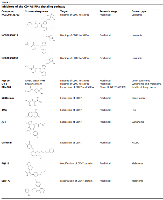 参考文献: Yu WB, Ye ZH, Chen X, Shi JJ*,Lu JJ*. The development of small-molecule inhibitorstargeting CD47. Drug Discov Today. 2021, 26(2): 561-568.