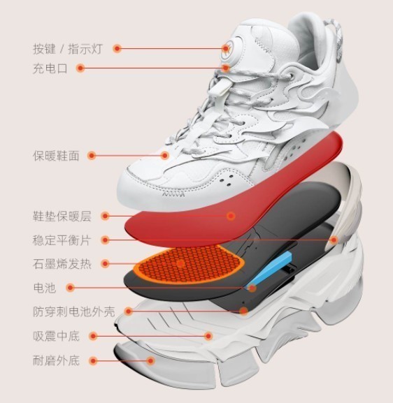 外形设计咱们就不多说了,反正笔者是无法理解这款鞋的美感。其主要是在鞋底前掌位置加入了一块石墨烯发热片,然后在足弓的位置加入了一块电池,实现加热效果,所以鞋底显的较厚。
