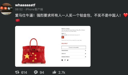 爱马仕推出国旗包销售一空,售价12万4千美元……