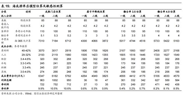 国信证券或许并没有料到,仅仅半年时间后,海底捞的翻台率就从3.4跌至了3.0盈亏线。而集团上半年的综合净利润率,如同模型中预测的一般,跌至0.48%。而海底捞“3.0盈亏线”的概念,也随之深入人心。