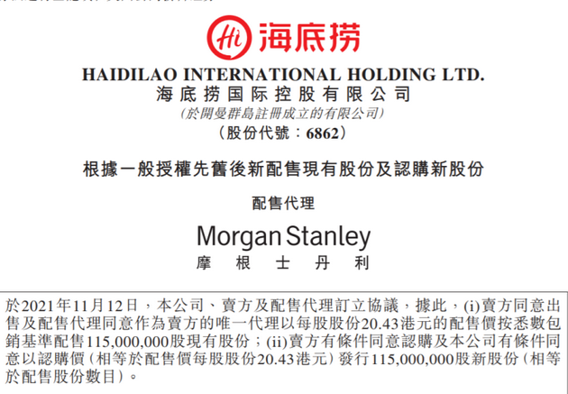 11 月 12 日,海底捞公告称,集团计划以每股 20.43 港元配售 1.15 亿股股份,筹资 23.37 亿港元(约合 人民币20 亿元),以“补充集团运营的长期资金”。所得款项 30% 用于提升供应链管理和产品开发能力;30% 用于偿还银行贷款融资;40% 用于集团营运资金及一般企业用途。