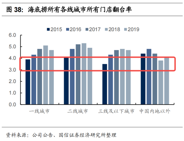 要知道,海底捞的门店翻台率并不是一直保持在“神话”水平。在2015年时,海底捞门店的翻台率水平还在4.0。直到2017-2018年时,海底捞上市时翻台率才飙升到了5.0左右的水平。