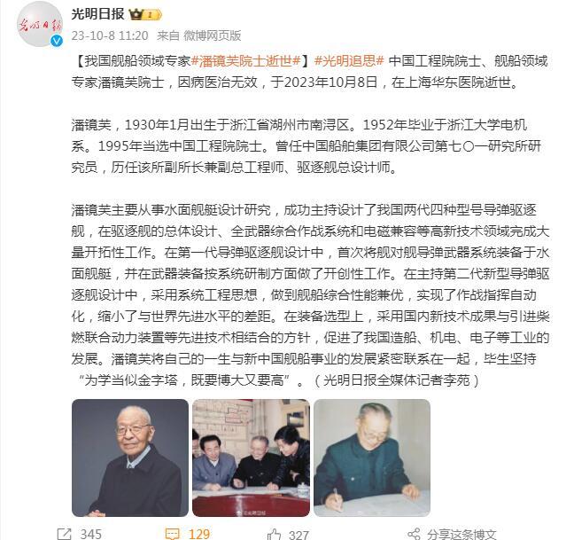 中国工程院院士、舰船领域专家潘镜芙院士,因病医治无效,于2023年10月8日,在上海华东医院逝世。