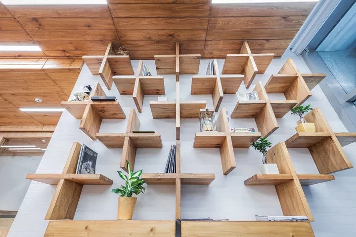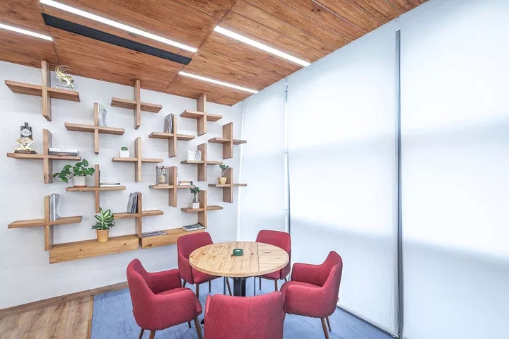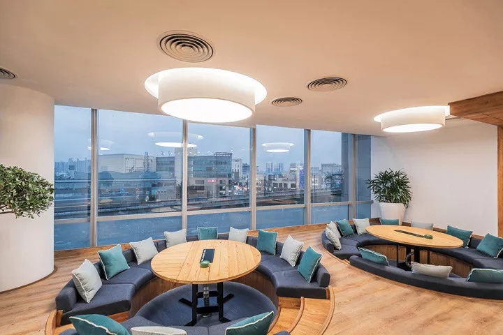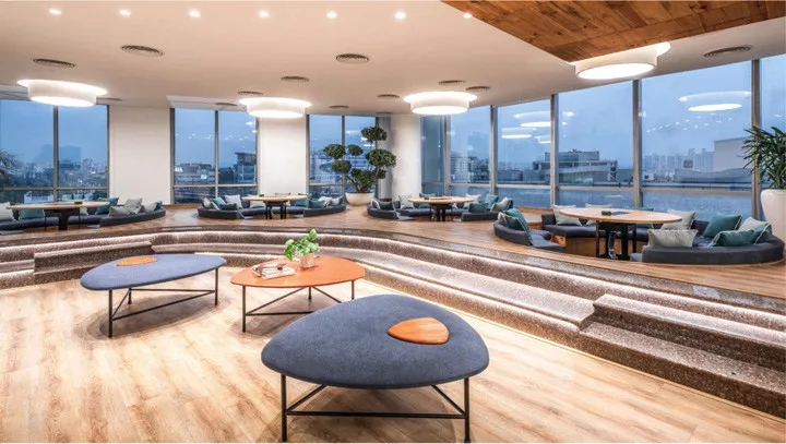 205平方米的办公空间被划分成两大功能区:会议厅和咖啡活动区。会议厅将支持市场营销和业务开发团队的正式讨论和演讲;而咖啡活动区则用于半正式和休闲的会议讨论。 升高的地台,嵌入的圆形下沉式座位区,配以大型圆木桌和明亮舒适的圆形光照,这里就是会议厅。与众不同的建筑形式让这里有着轻松闲适的惬意氛围,以创新形式鼓励和促进头脑风暴和团队协作。
