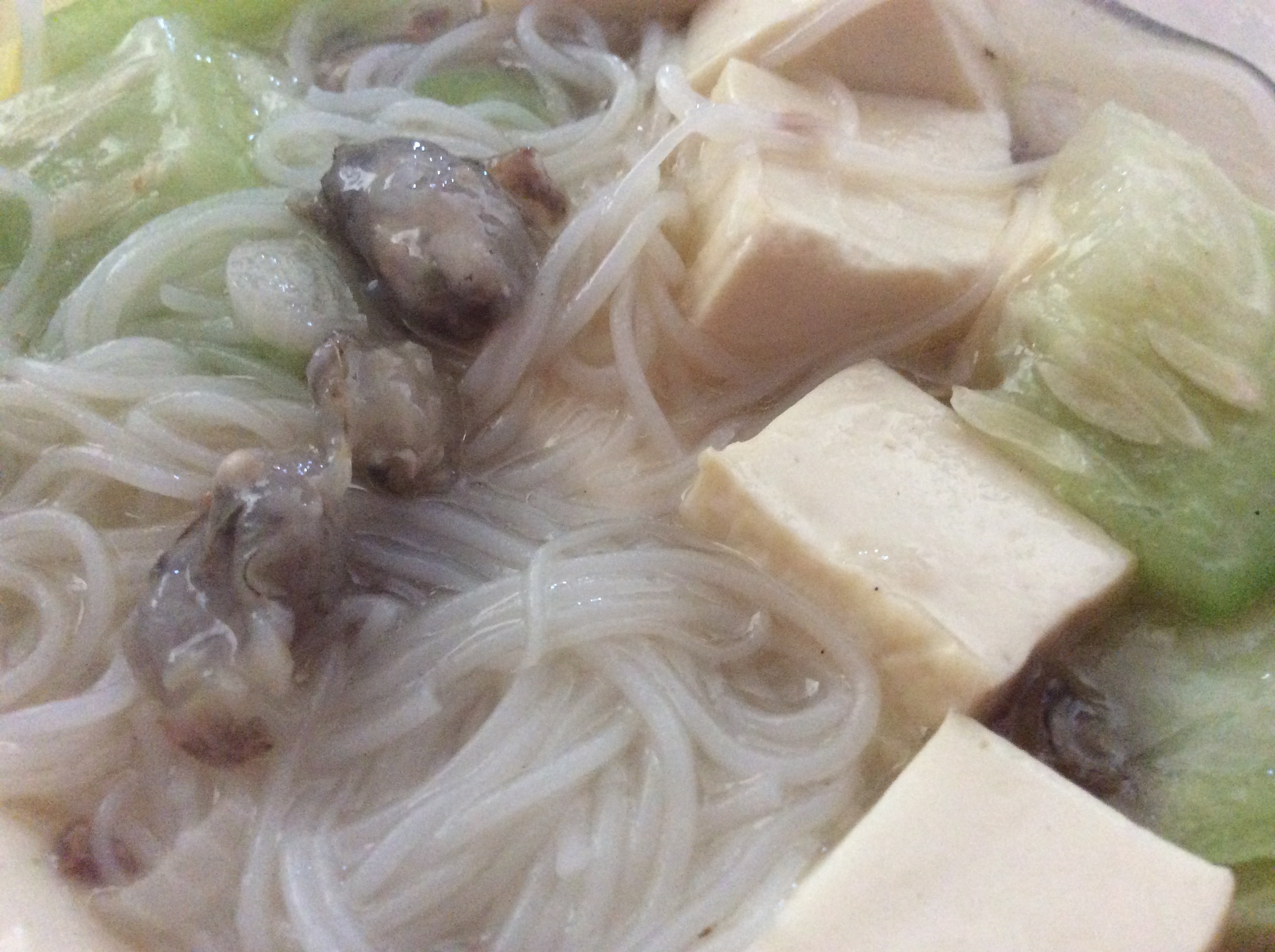 昨夜连滚带爬,奔来吃他的蚵仔豆腐丝瓜面,今午守株待兔吃他送来的蚵仔豆腐丝瓜米粉,主料不一样,配料相同。